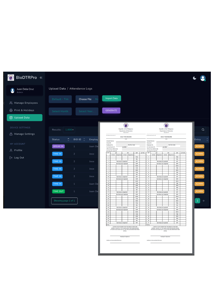 BioDTRPro intelligently converts raw biometric logs into accurate and compliant Daily Time Records. With smart time-code recognition, schedule awareness, and automatic log resolution, the system ensures every entry is precise eliminating manual errors and simplifying attendance management for modern institutions.
